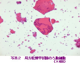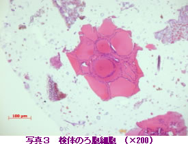 乾燥甲状腺の検査方法は、ダイエット食品中から甲状腺ホルモンを抽出して、甲状腺ホルモンであるチロキシンと3,5,3’-トリヨードチロニンを液体クロマトグラフ-質量分析計(LC-MS)を用いて分析します。さらに、顕微鏡下で甲状腺に特異にみられる、ろ胞細胞の有無の確認を行います(写真2、3)。この確認には、検体を包埋し、プレパラートに組織を定着させ、染色する組織学的検査法で行います。なお、ポジティブコントロールは局方乾燥甲状腺を使いました。