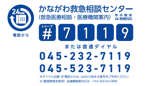 病気やけがで迷ったら、♯7119(または045-232-7119、045-523-7119)とダイヤルいただくと、「救急受診できる病院・診療所」、「今すぐに受診すべきか救急車を呼ぶべきか」を電話相談できます。(相談料は無料ですが、通話料は相談者の負担となります)