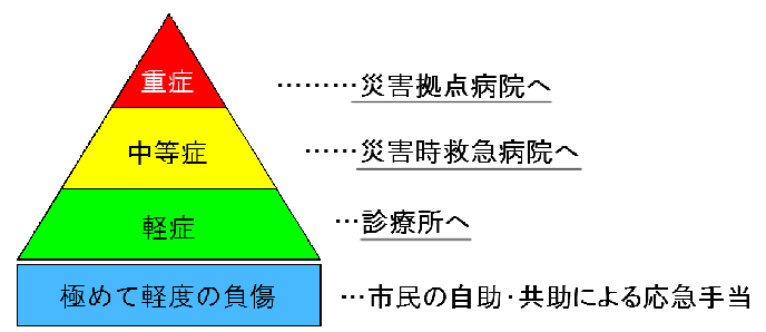 | 軽症 | 生命の危険がなく、入院を要しない | 負傷者等の受入れが可能な診療所 | ○創傷、打撲、やけど、骨折等の外傷に対する応急医療 ○内因性疾患に対する応急医療 |