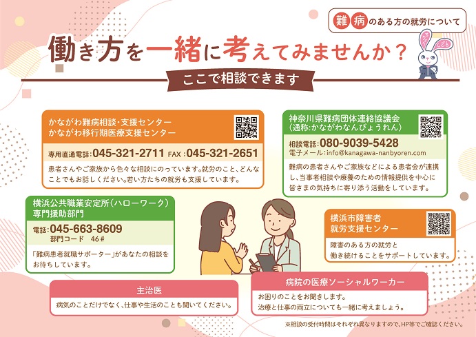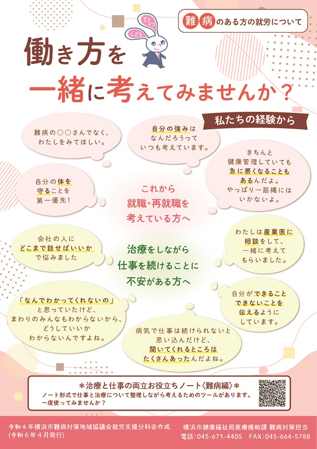 横浜市では令和4年難病対策地域協議会就労支援分科会にて、難病のある方の就労についてのチラシを作成しました。