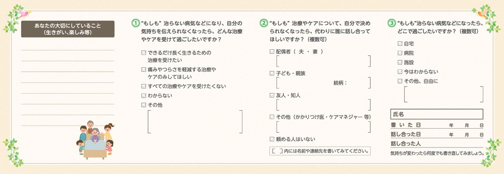 「もしも治らない病気等になったら」「もしも自分の気持ちを伝えられなくなったら」というときを想定し、中面に3つの質問が載っています。