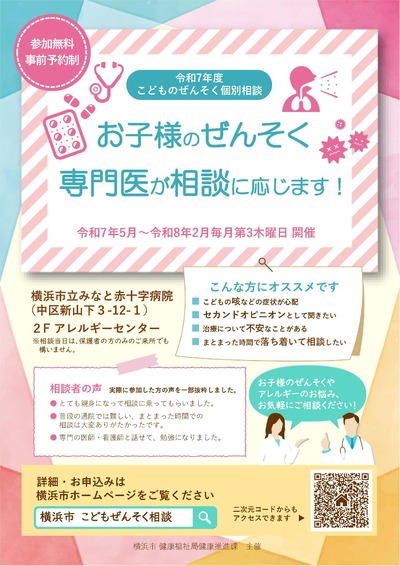 ぜんそく・アレルギーに関する心配ごとやお悩みごとについて、横浜市立みなと赤十字病院の小児科医師及び保健師等による個別相談を実施します。