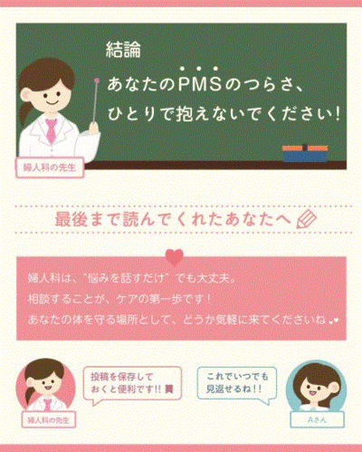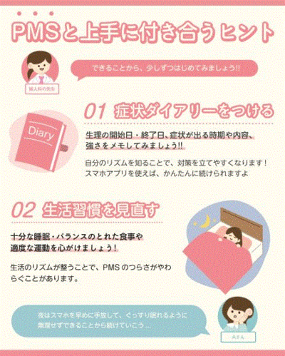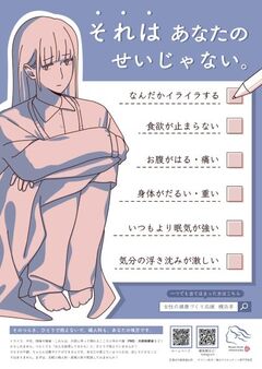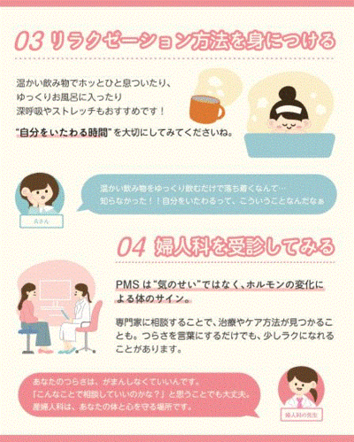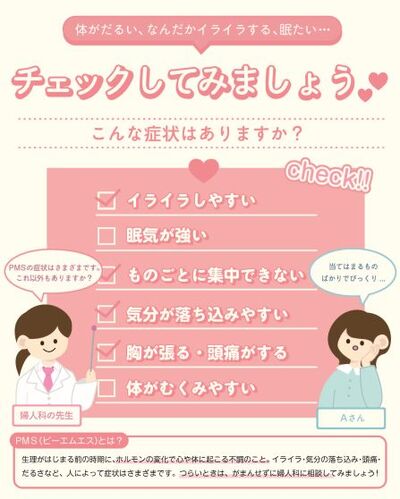 若い世代の感性を生かしたデザインにより、PMS(月経前症候群)などの対処についてわかりやすく伝える内容となっています。