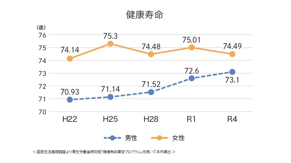 健康寿命とは、日常生活に制限がなく自立して健康的に生活できる期間のことです。 横浜市は、男性が伸びているにもかかわらず、女性は短縮傾向です。