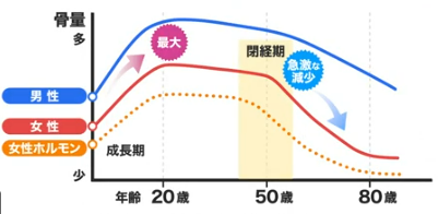 骨量は、おおむね20歳前後がピークといわれています。特に女性は、閉経後に女性ホルモンが激減することで骨量が大きく低下するため、若い時期から骨を丈夫に保つことが大切です。