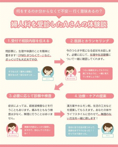 ※婦人科では、必要に応じて他の病気の有無の確認、低用量ピルやホルモン剤、漢方薬などの処方も受けられます。