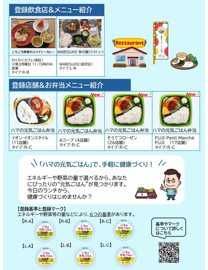 ハマの元気ごはん提供店登録制度に登録した横浜市内の食品関連事業者(スーパーマーケット、弁当・総菜店、コンビニエンスストア、飲食店、特定給食施設)のことを「ハマの元気ごはん提供店」といいます。