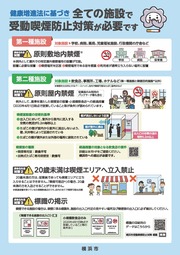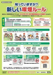 2020年4月、健康増進法の一部を改正する法律が全面施行されました。改正法は、望まない受動喫煙の防止を図るため、特に健康影響が大きい子ども、患者の皆さんに配慮し、多くの方が利用する施設の区分に応じ、施設の一定の場所を除き喫煙を禁止するとともに、管理権原者の方が講ずべき措置等について定めたものです。