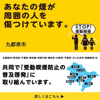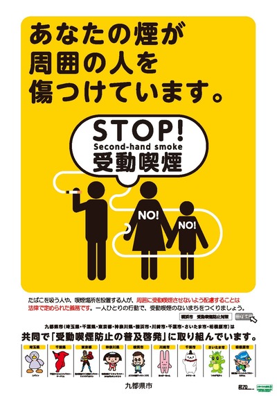 九都県市(埼玉県、千葉県、東京都、神奈川県、横浜市、川崎市、千葉市、さいたま市、相模原市)では、毎年9月のがん征圧月間に始まる3か月間、「九都県市受動喫煙防止対策共同キャンペーン」を実施しています。