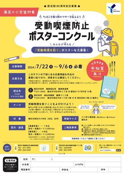 夏休み期間中に西区の小学生を対象として、「受動喫煙の防止」をテーマとしたポスターコンクールを開催します。