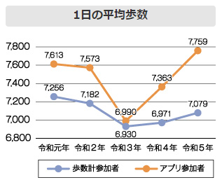 参加者の平均歩数は、コロナ禍での外出自粛等の影響で減少しましたが、令和4年度以降、再び増加傾向となり、令和5年度のアプリ参加者の平均歩数は過去最高となっています。