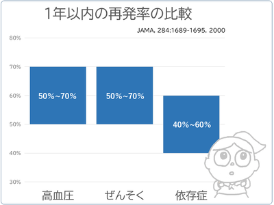 依存症は回復できます!一度依存症になってしまうと回復することはできないというのは多くの人が抱く、依存症に対する誤解です。また、依存症には再発がつきものと考える人も多いのですが、依存症の再発率は40~60%と言われており、これはぜんそくや高血圧といったありふれた病気の再発率(50~70%)と同程度であり、決して極端に高いわけではありません。