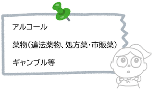 アルコール、薬物、ギャンブル等はセルフチェックで簡単に確認することができます。気になる人はぜひセルフチェックをやって調べてみたり、相談窓口で相談してみましょう。