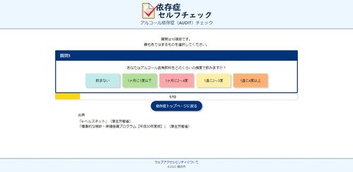 依存症セルフチェックのページでは、簡単な10問の質問に回答することで、アルコール依存の危険性が簡易的に判定されます。