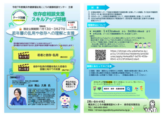 各研修についてのお問い合わせは、横浜市こころの健康相談センター依存症対策事業担当(045-662-3543)までお願いいたします。
