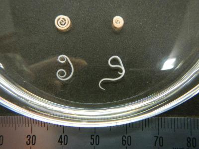 アニサキスとは、2~3cm程度の半透明白色の寄生虫で、サバ、イワシ、サンマ、カツオ、イカなどに寄生しています。