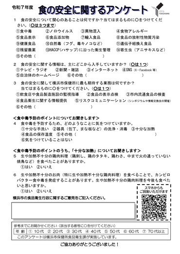 令和8年度「横浜市食品衛生監視指導計画」策定に向けて、市民の皆様からの御意見を反映させるため「令和7年度食の安全に関するアンケート」を実施します。ご協力よろしくお願いします。