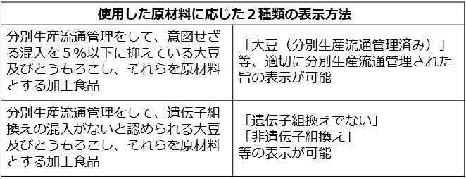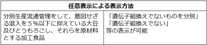 | 概要 | 遺伝子組換え表示には、義務表示と任意表示がありますが、任意表示の表示制度が次のとおり改正されました。