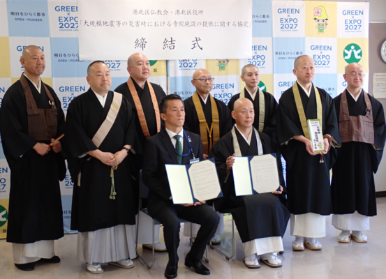 本協定は、令和4年6月に横浜市と横浜市仏教会で締結した施設提供の包括的な協定に基づいて港北区と港北区仏教会が締結したもので、西区、瀬谷区、保土ケ谷区、旭区に続き市内で5例目となります。