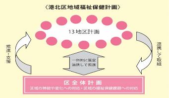 港北区地域福祉保健計画は、区内13の「地区計画」と「区全体計画」から構成されています。