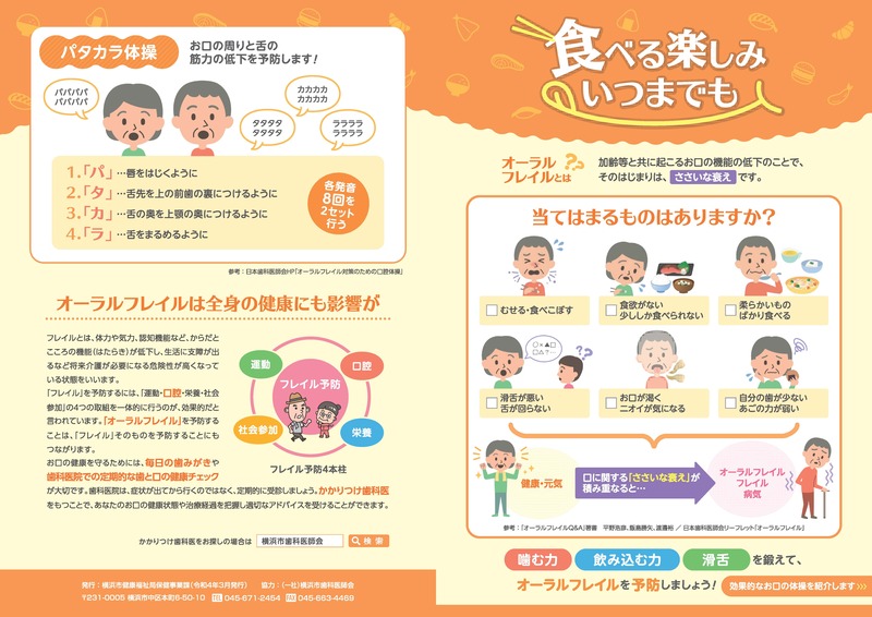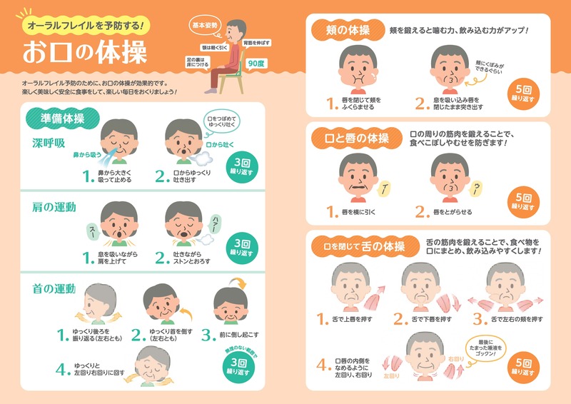 オーラルフレイル予防のためにお口の体操が効果的ですので、以下のリーフレットをご参照ください。
