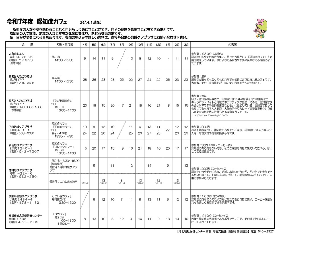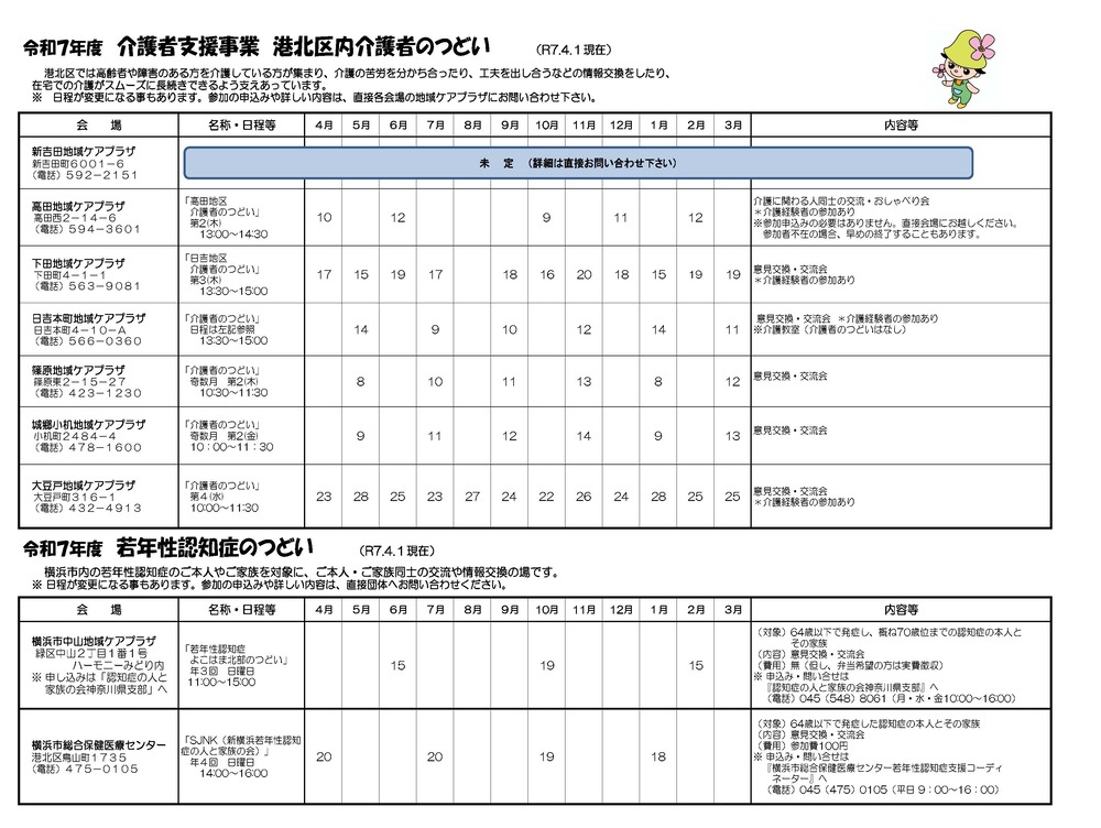 介護者のつどい・認知症カフェ年間スケジュール