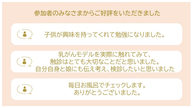 - 内容:乳がん検診車の展示・内部見学、女性のがんに関するパネル展示、乳がんモデル体験