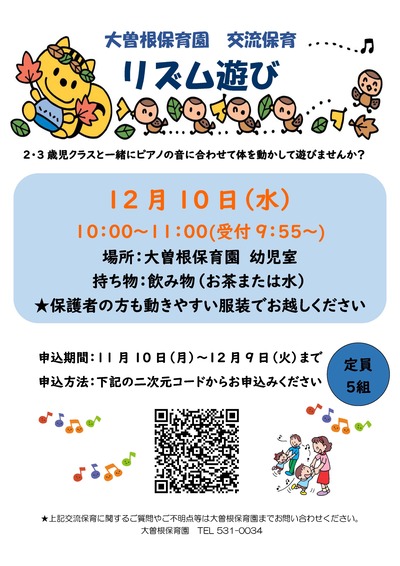 お申し込みは、開催日の約1か月前より、園正門横の育児支援事業掲示板のQRコードまたは当ページ掲載のチラシからどうぞ。