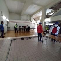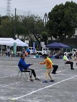この日は「お水遊び」の予定でしたが、当日の朝は雨模様、主任児童委員をはじめとするスタッフの皆さんの素早い対応により、急遽「室内遊び」に変更されました。22組の親子が集まり10時すぎにスタート、みんなで手遊びをした後に、ボールプール、魚釣り、ストラックアウトなど各ブースで遊び、あっという間に90分のプログラムは終了。