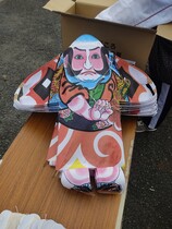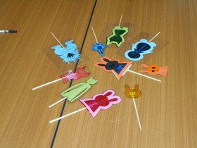 子どもたちの作品。影絵で映せるように、セロハンで色付けしたり操り棒を付けました。中には飛行機やゴジラも。