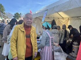 甘酒ブース前で 大曽根連合自治会 高橋会長