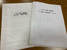 月に1回集まり、参加者で物語や台本を考え練習し、朗読劇にしてやすらぎ塾の他のメンバーも集まる茶話会で披露をしています。