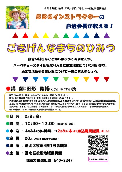 「自分の好きなことからはじめる地域活動」について、BBQインストラクターの資格を持つ自治会長を講師に迎え、講演会を行います。