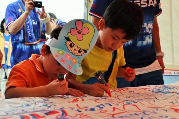 試合当日は、区制80周年を記念した横断幕に、ご来場の皆様からメッセージをいただきました。