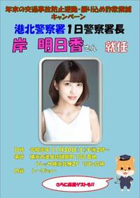 12月1日から始まる飲酒運転根絶強化月間及び12月11日から実施される年末の交通事故防止運動に先駆け、一日警察署長にタレントの岸明日香さんを委嘱し年末の交通事故防止運動・振り込め詐欺撲滅キャンペーンを実施します。また、ラグビーワールドカップ日本代表の茂野海人選手が交通安全大使、木津悠輔選手が詐欺撲滅大使として参加しキャンペーンを盛り上げます。