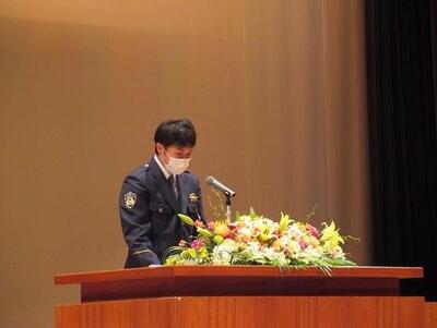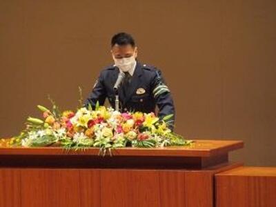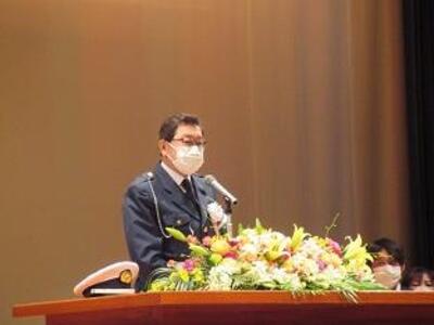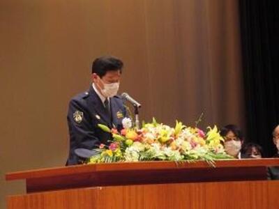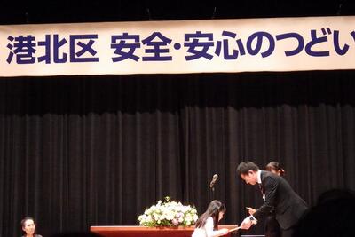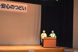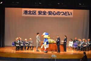 交通安全功労者、ポスターコンクール入賞者、防犯功労者の表彰と講話を行ったほか、港北区から交通事故や犯罪がなくなり、「安全・安心なまち」となるよう、トリコロールマーメイズに交通安全宣言及び防犯決意表明を読み上げてもらいました。