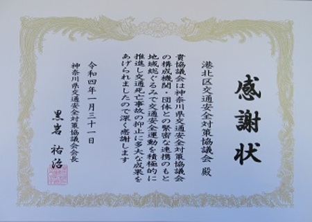 神奈川県交通安全対策協議会から、令和3年度交通安全対策推進優良協議会として港北区交通安全対策協議会が感謝状を頂きました。