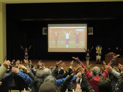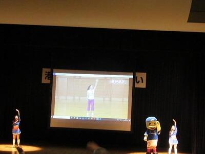 第一部では、交通安全功労者、ポスターコンクール入賞者、防犯功労者の表彰と講話を行ったほか、「港北区安全・安心大使」の 横浜F・マリノスの「マリノスケ」と 横浜F・マリノスオフィシャルチアリーダーズ、トリコロールマーメイズの方々ご協力をいただき、フレイル予防(港北MMダンス)を行いました。