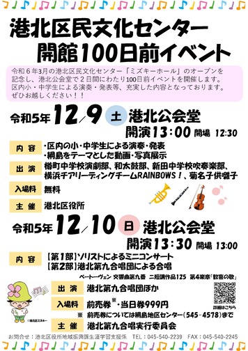 港北区民文化センター「ミズキーホール」のオープンを記念し、港北公会堂で2日間にわたり開館100日前イベントを開催します。