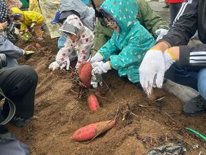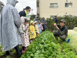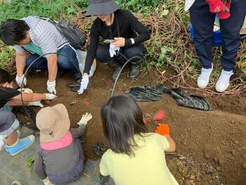 - 少雨の中、ながさわファームの長澤様に、おいしい食べ方や保存方法を教わりながら、サツマイモ・小松菜の収穫を体験しました。さらに、JA横浜様によるクイズ形式の講話で、地産地消について楽しく学びました。