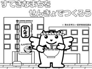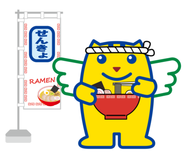 選挙でもたくさんの人が投票に来ることを願い、めいすいくんはたくさんの具がトッピングされたラーメンを食べています。