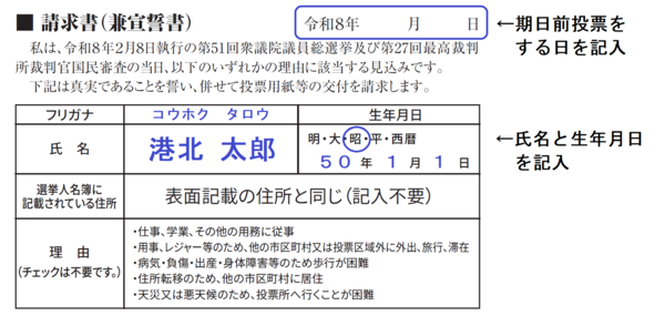 ご案内の裏面は、期日前投票をするときの「請求書(兼宣誓書)」です。期日前投票にお越しの際は、ご自宅などで事前に記入の上お持ちいただくとスムーズに受付ができます。(投票日当日は記入不要です)