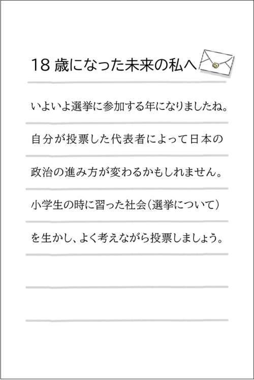 投票することへの期待感や、自分の一票でかなえてほしい夢や希望を、ご自身の言葉やイラストで表現し、投票参加の大切さを伝えるメッセージカードを作ってください。