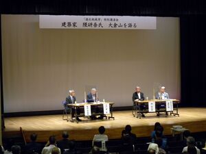 後半の平井氏、飯田氏、横浜市港北区長も交えて4人のフリーディスカッションでは、昔の大倉山について楽しくトークが始まり、隈氏の幼少期のエピソードや東急沿線や大倉山記念館での思い出、隈氏が手掛けられた歓成院(大倉山2丁目)の庫裡の写真も披露されました。
