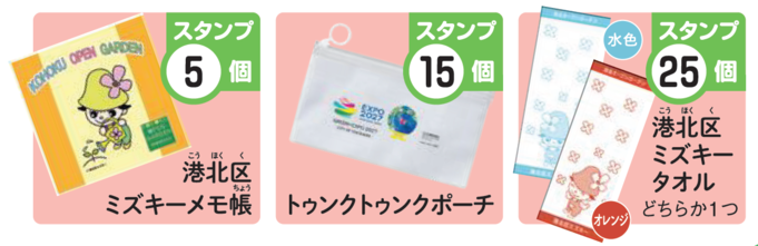 【スタンプラリー景品】スタンプ5個でミズキーメモ帳、スタンプ15個でトゥンクトゥンクポーチ、スタンプ25個でミズキータオル