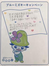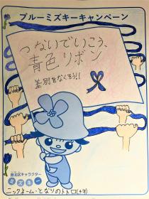 港北区キャラクター「ミズキー」が青くなり、人権へ配慮した思いやる心を持つことや自分達ができる感染対策などを