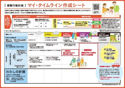 マイ・タイムラインとは、台風や大雨の水害等、これから起こるかもしれない災害に対し、一人ひとりの家族構成や地域環境に合わせて、あらかじめ時系列で整理した自分自身の避難行動計画のことです。