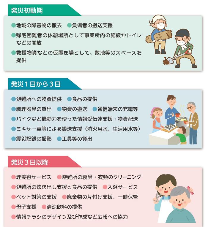 それぞれの事業特性や保有する資格・技術を活かした応急活動や支援等で、地域への共助活動として貢献していただく協働隊と