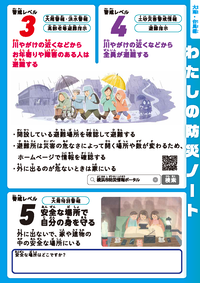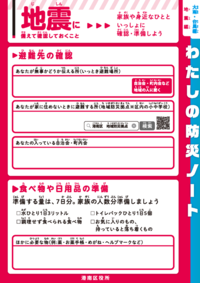 災害(地震・風水害)時に取るべき行動が一目でわかるように、自分の避難先や必要な物品を直接書き込み、オリジナルの防災ノートを作ることができるパンフレットです。簡単でわかりやすい表現とし、イラストを多く使用していますので、障害の有無に関わらず、小さなお子さんから高齢者の方までお使いいただけます。