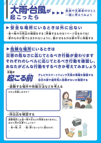 近年、ゲリラ豪雨や台風などの大雨、暴風による被害が多発しています。障害のある方及びその御家族向けに、風水害に対して日頃から備えておくこと、いざ発災したときに取るべき行動など、知っておきたい内容を記載したパンフレットです。